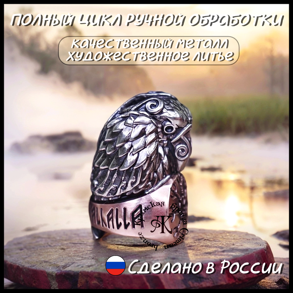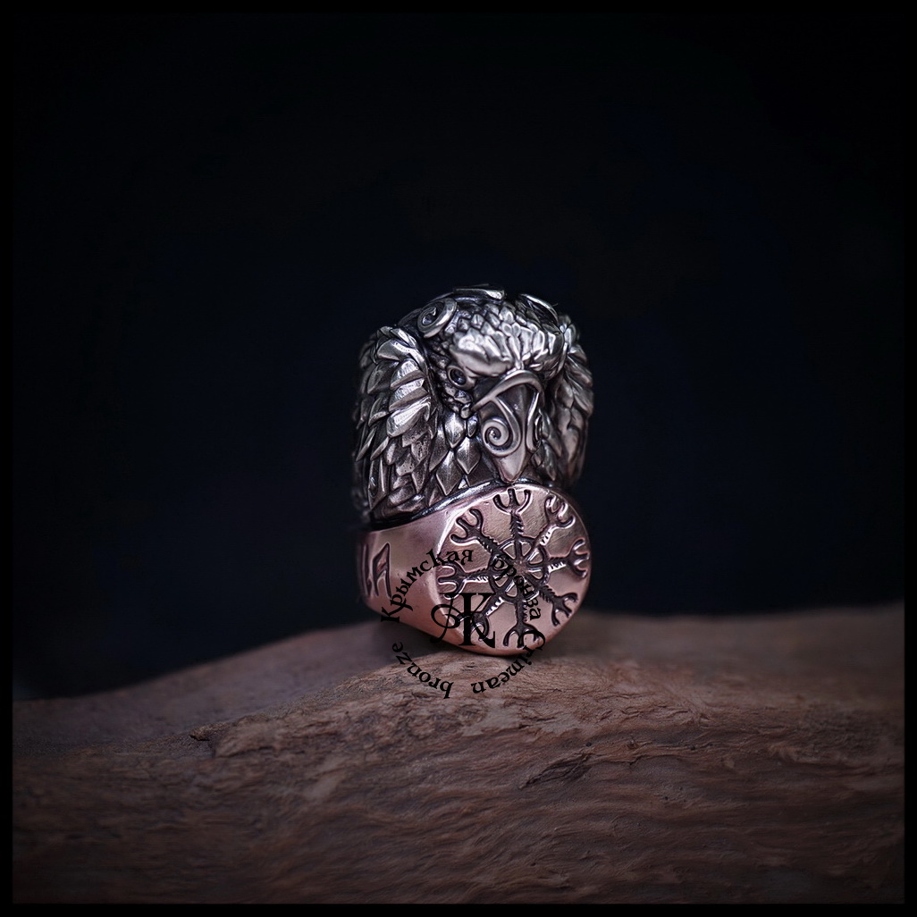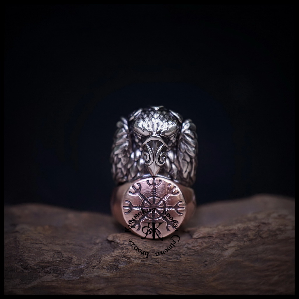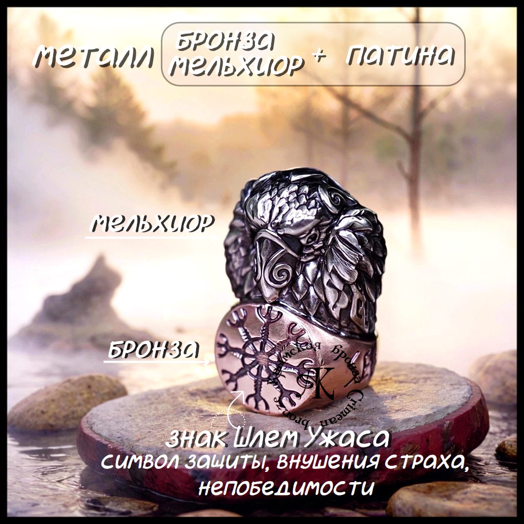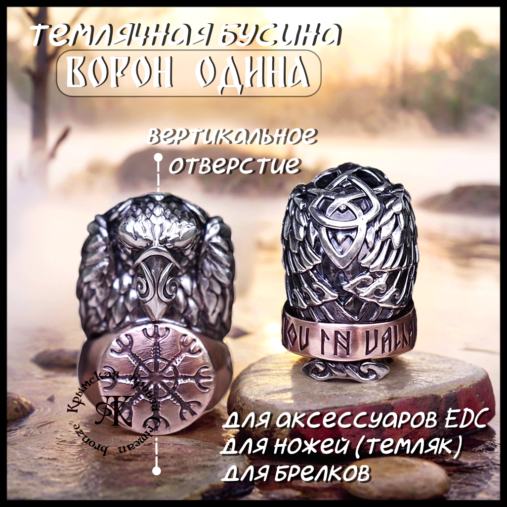 - бусина отлита из двух металлов : сам Ворон отлит из мельхиора , а кольцо , на котором он сидит из бронзы , знак Шлем Ужаса - Агисхьяльм, ручная обработка