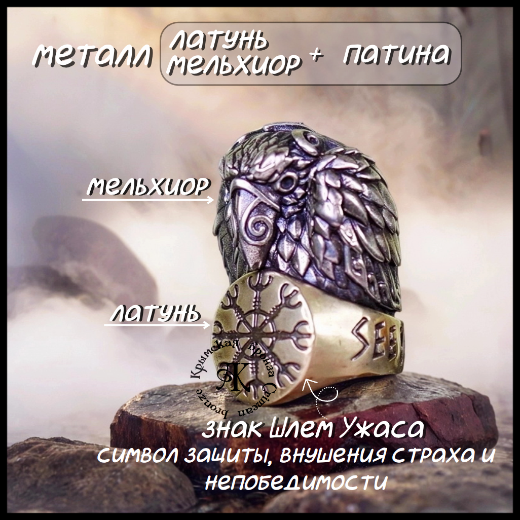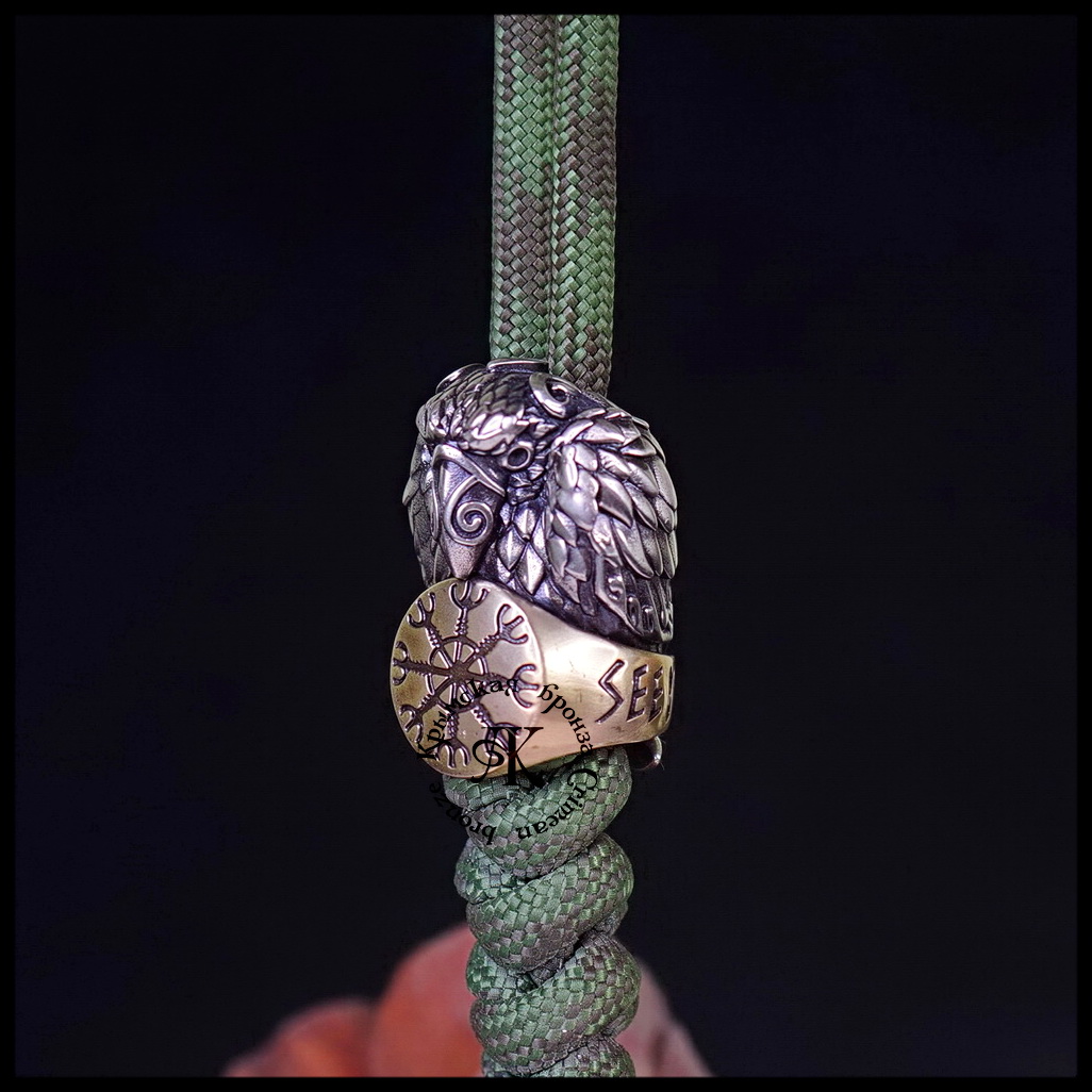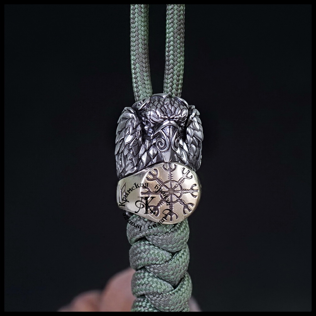 - бусина отлита из двух металлов : сам Ворон отлит из мельхиора , а кольцо , на котором он сидит из латуни , знак Шлем Ужаса - Агисхьяльм, ручная обработка