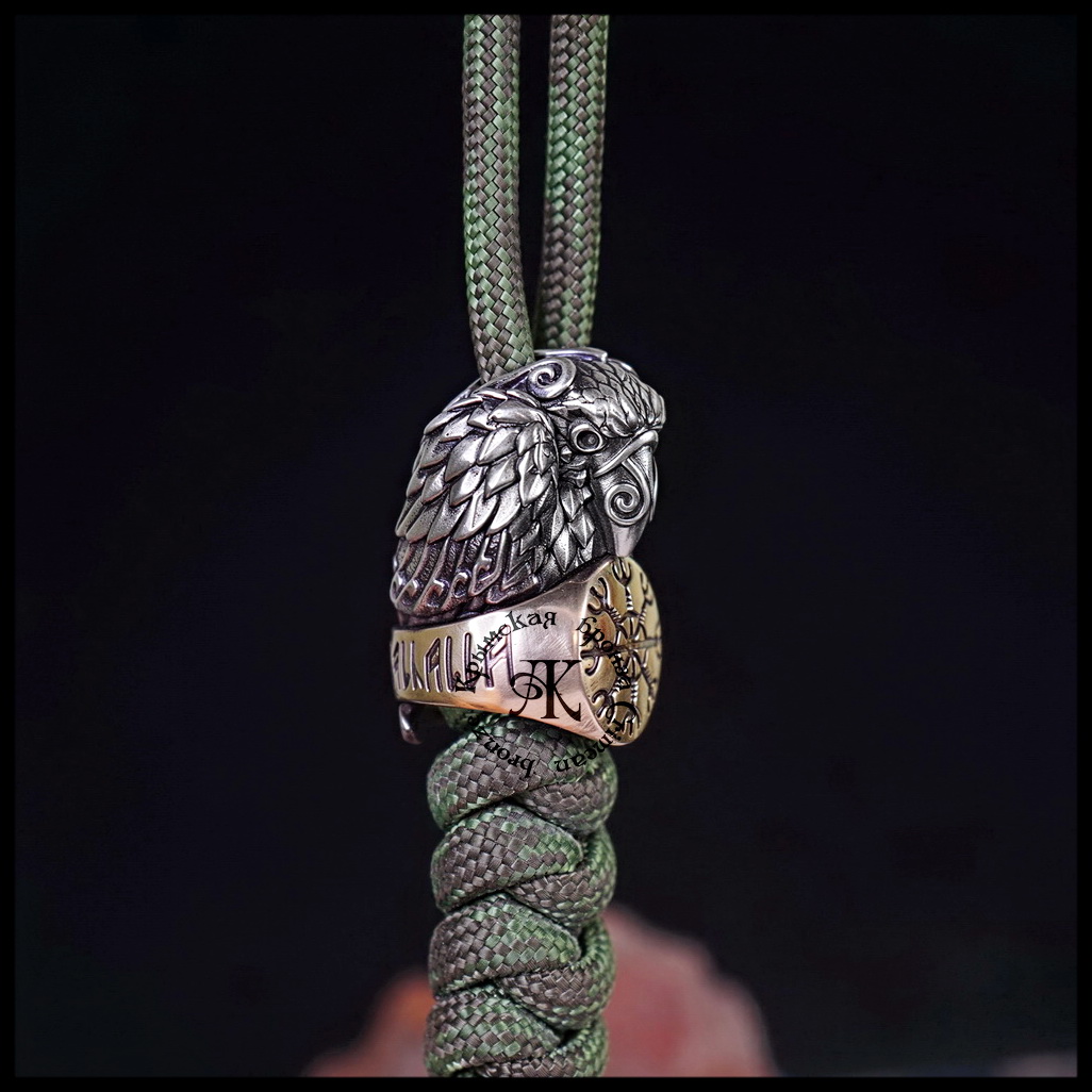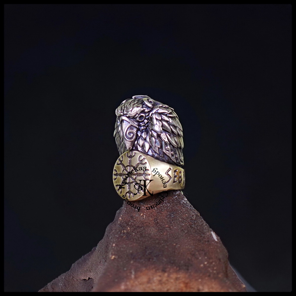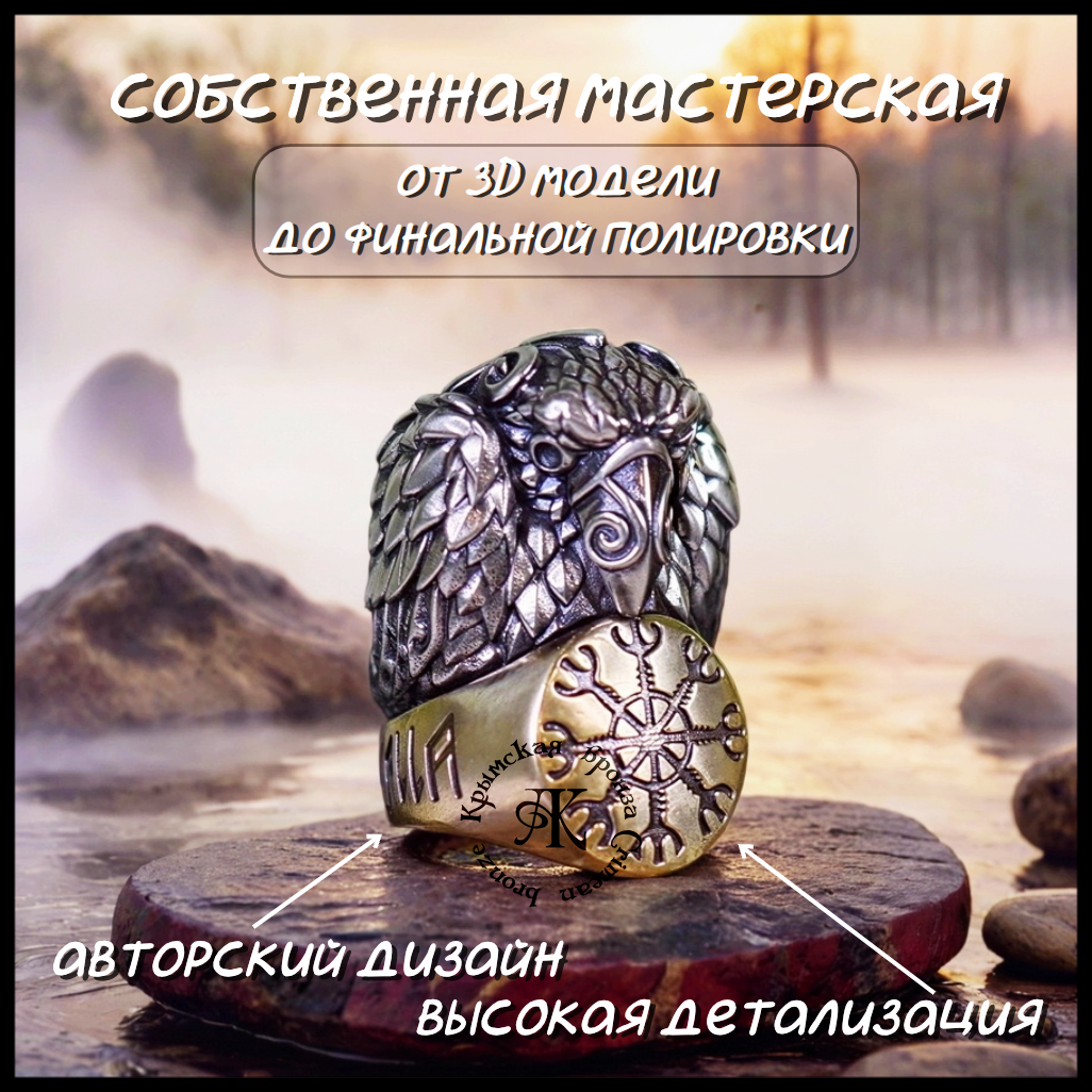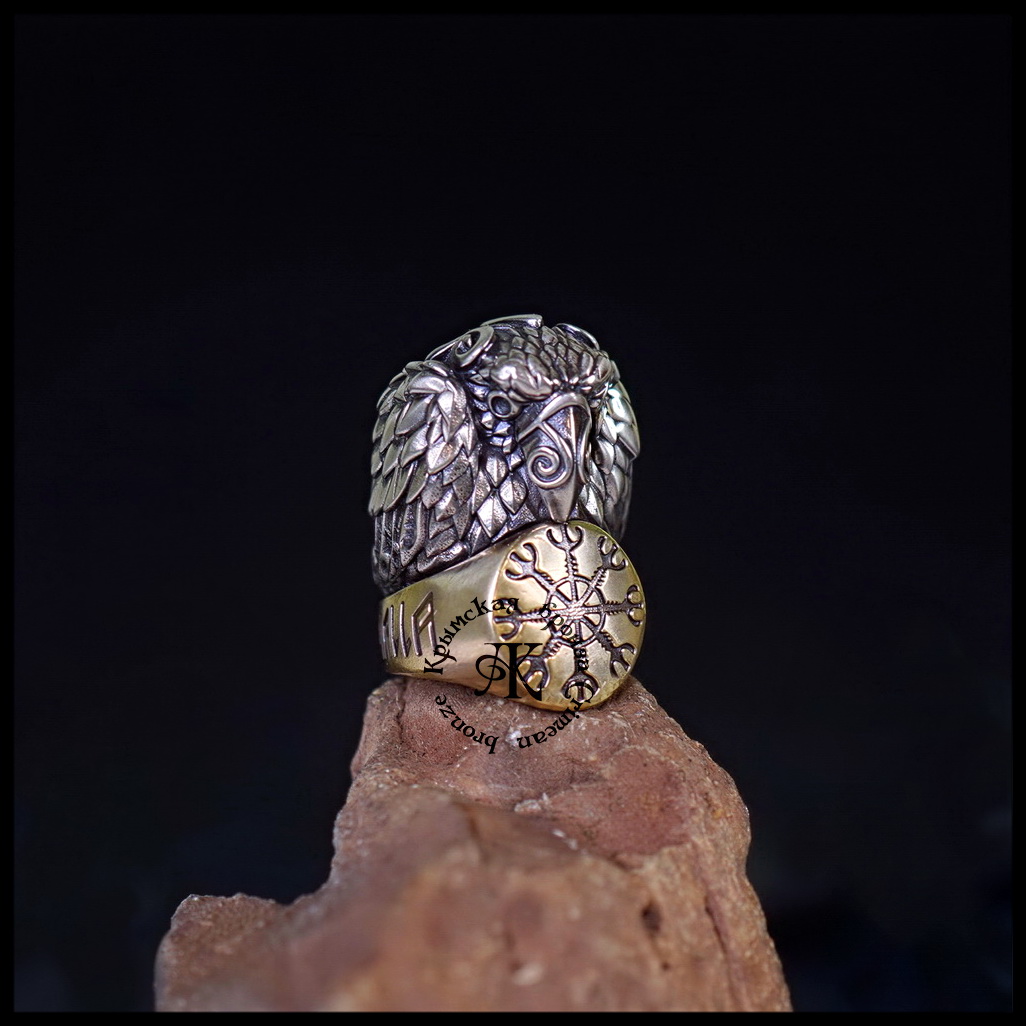 - бусина отлита из двух металлов : сам Ворон отлит из мельхиора , а кольцо , на котором он сидит из латуни , знак Шлем Ужаса - Агисхьяльм, ручная обработка