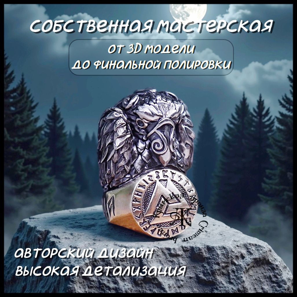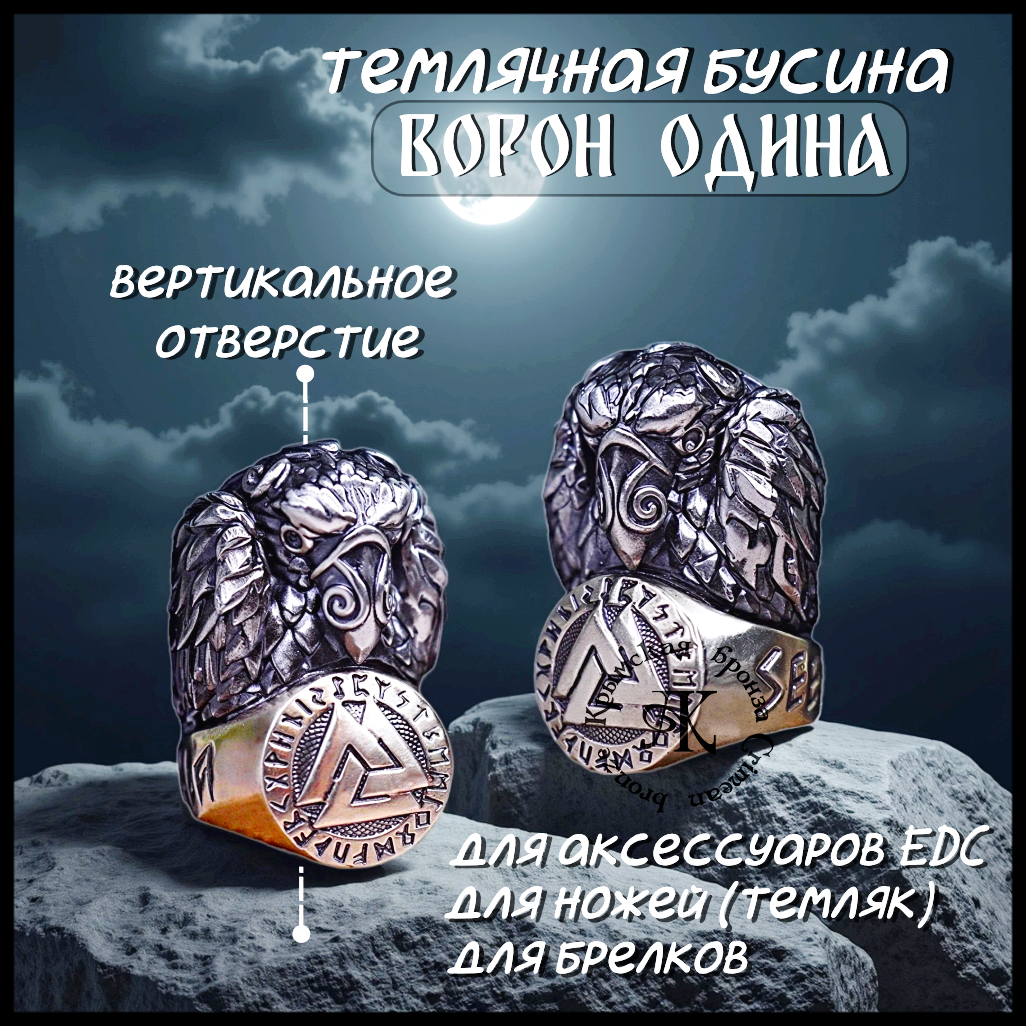 - бусина отлита из двух металлов : сам Ворон отлит из мельхиора , а кольцо , на котором он сидит из латуни, символ - Валькнут, ручная обработка